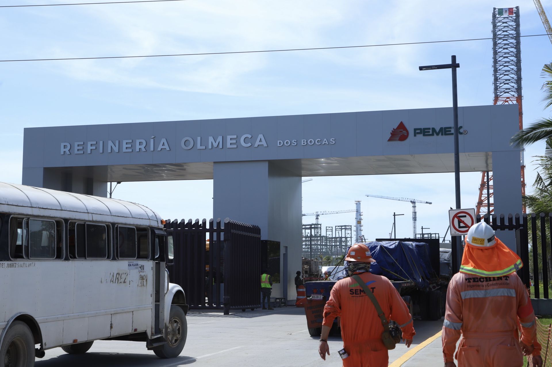 Trabajadores se dirigen a la entrada dela refinería de Dos Bocas. Foto: Cuartoscuro.