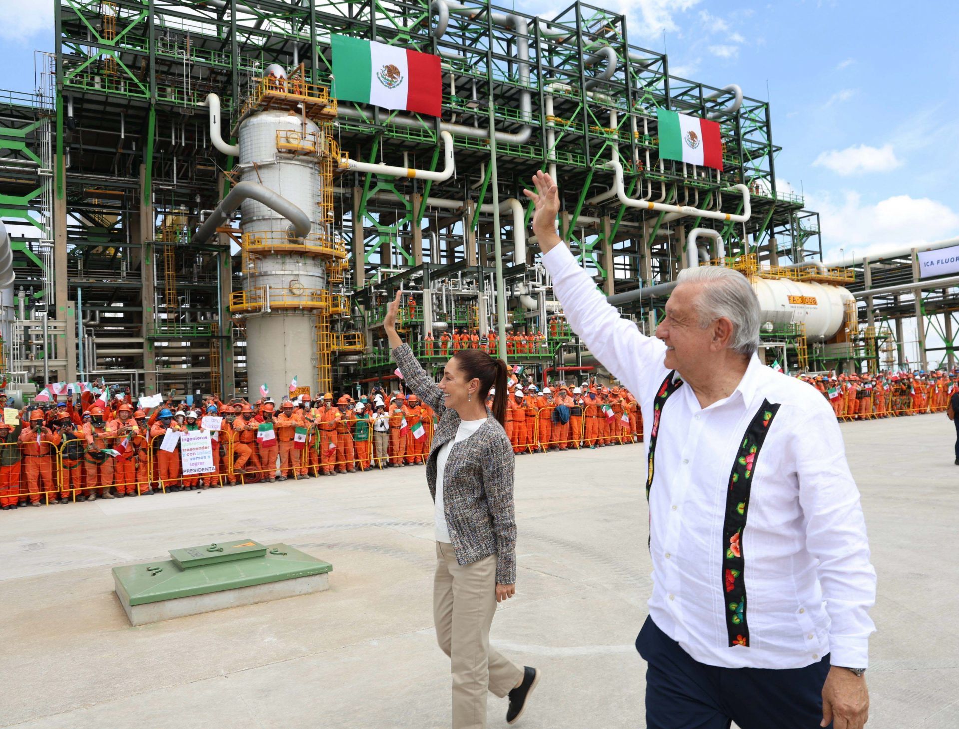 Claudia Sheinbaum, virtual Presidenta electa, y Andrés Manuel López Obrador, Presidente de México, saludan a trabajadores durante su llegada a la supervisión de la Planta Coquizadora de la Refinería de Tula. Foto: Cuartoscuro.