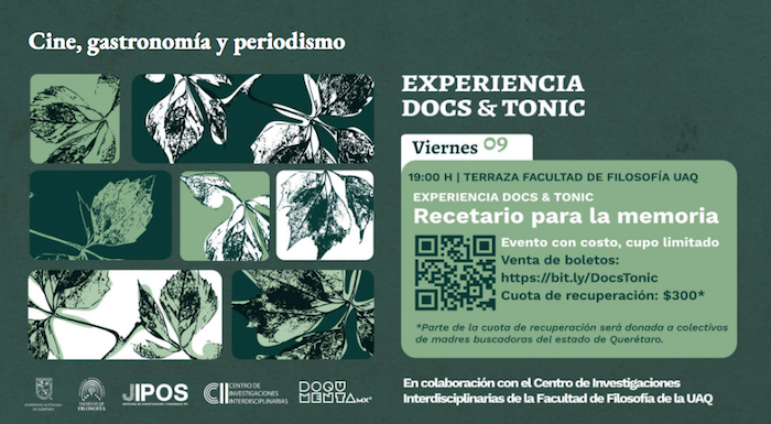 El Festival Internacional de Cine y Narrativas de No Ficción donará parte de la cuota de recuperación de “Docs & Tonic: Recetario para la memoria” a colectivos queretanos de madres buscadoras.