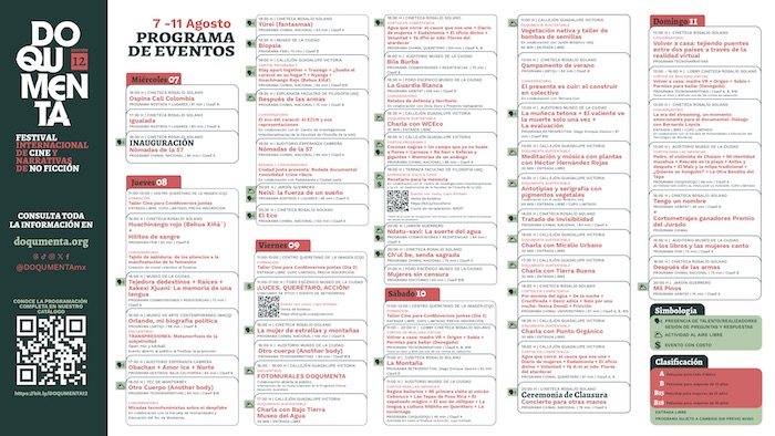 Para su duódecima edición, Doqumenta contará con 76 títulos, de los cuales 22 son largometrajes y 54 son cortometrajes; 61 de ellos son títulos mexicanos y 15 son internacionales –Alemania, España, Francia, Portugal, Canadá, EU, Chile, Panamá, Ecuador, Colombia, Brasil y Perú–, además de que 41 títulos están dirigidos o codirigidos por mujeres.