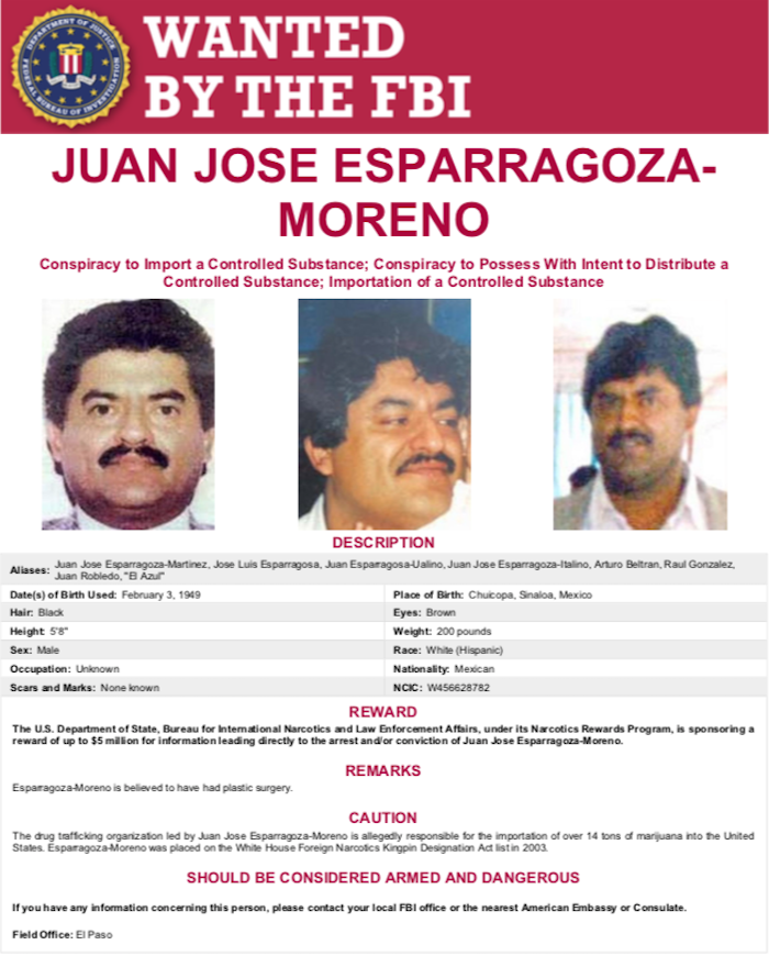 Juan José de Jesús Esparragoza Moreno, “El Azul”, es el otro de los tres jefes de una generación de narcotraficantes de la vieja escuela sobre cuyo destino no hay certezas. Algunas versiones dicen que murió el 7 de junio de 2014; otros, como las autoridades de Estados Unidos, no han querido declararlo muerto porque no existe evidencia de que así sea. Como sea, la captura de “El Mayo” Zambada pone punto final a una historia que se remonta a la fundación misma de los cárteles mexicanos; a la raíz; al origen. Esparragoza Moreno, “El Azul”, sería el único de aquellos que sigue libre. Si es que está vivo.