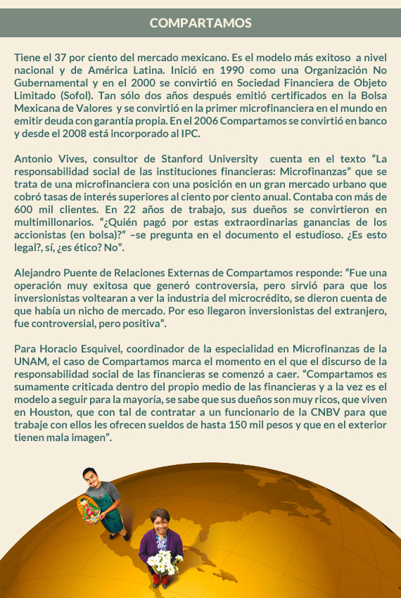 “El microcrédito no es para eso”, me dicen de inmediato los directivos de las microfinancieras. Jorge Kleinberg, director de Te Creemos, expone: “Los préstamos son para mejorar la calidad de vida de las personas (en lo inmediato). Son una herramienta para quienes tienen cierta capacidad de pago, de hecho hay un piso donde las microfinancieras no deben meterse y es con personas que apenas pueden adquirir sus alimentos, a ellos no hay que prestarles porque literalmente se comerían el dinero, a ellos el gobierno los tiene que atender con apoyos”, señala. “Erradicar la pobreza no es tarea fácil, si existiera una solución precisa y efectiva se hubiera llevado a cabo desde hace tiempo”, refuerza la economista Paloma Merodio. Alejandro Puente de Compartamos, me dice a su vez: “Antes de un crédito, la gente tiene que comer, vestirse y transportarse, nuestros clientes no son pobres, prestamos al sector socioeconómico “D”, a los que están en la base de la pirámide”.