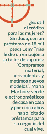 ¿Es útil el crédito para estas mujeres?, sin duda, con un préstamo de 18 mil pesos Leny Frías le dio un empujón a su taller de zapatos: “Compramos material, herramientas y metimos nuevos modelos”. María Martínez vende electrodomésticos de casa en casa y por cinco años ha solicitado préstamos para su negocio del cual vive. Carla Ramírez vende dulces, ahora pedirá la tercera parte de lo que solicitó el ciclo pasado pues sus ventas, me comenta, han bajado.