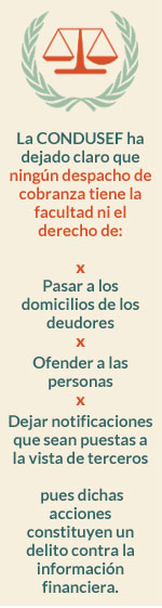Sin duda quien solicite un préstamo está obligado a pagarlo, pero al respecto la Comisión Nacional para la Protección y Defensa de los Usuarios de Servicios Financieros (CONDUSEF) ha dejado claro que ningún despacho de cobranza tiene la facultad ni el derecho de pasar a los domicilios de los deudores, ni de ofender a las personas, ni de dejar notificaciones que sean puestas a la vista de terceros, pues ello constituye un delito contra la información financiera; además de que las cobranzas extrajudiciales no otorgan atributos a los despachos para actuar por cuenta propia y por encima de la ley.