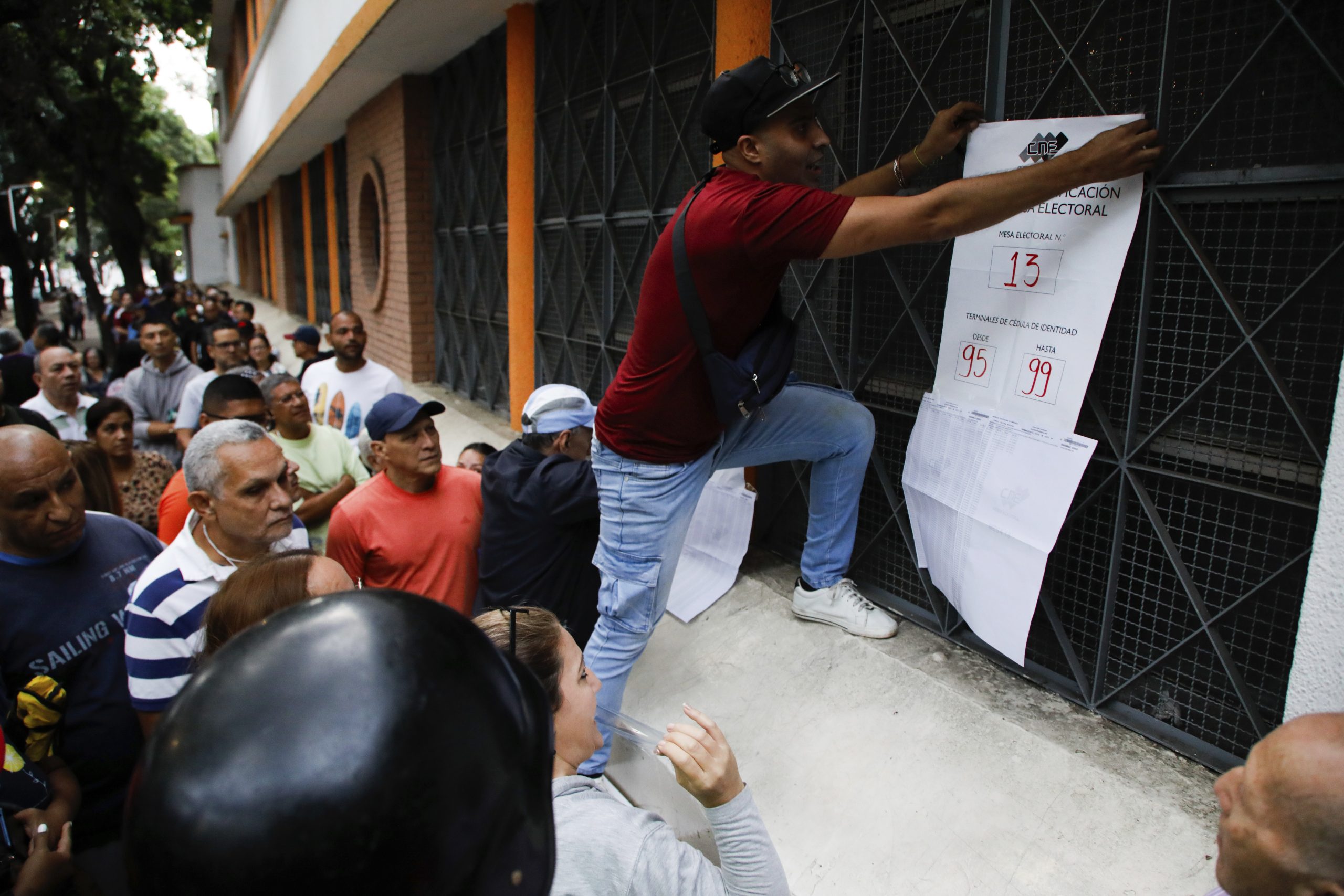 Un funcionario electoral publica información sobre los colegios electorales mientras se retrasa la apertura de las urnas para las elecciones presidenciales en la Escuela Andrés Bello, el principal centro de votación en Caracas, Venezuela, el domingo 28 de julio de 2024. Foto: Cristian Hernández, AP.