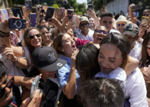 La líder opositora María Corina Machado abraza a sus simpatizantes. Foto: AP