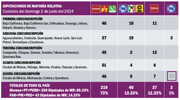 Además, si observamos los resultados que Morena y sus aliados lograron en la contienda de diputados de Mayoría Relativa, votación que servirá como referencia en cada una de las Cinco Circunscripciones Electorales para la asignación de diputados de Representación Proporcional, los porcentajes son aplastantes.