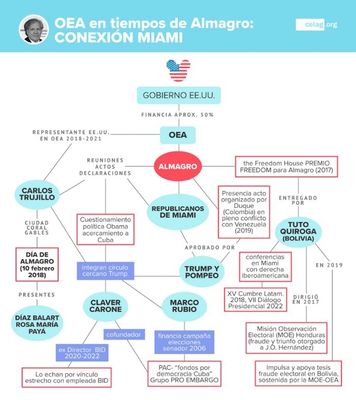 De hecho, Almagro y Trump tienen un vínculo con la denominada "conexión Miami", una red de poder que desde esa ciudad de Florida articula instituciones, grupos y trayectorias personales de la derecha anti-Cuba, anti-Venezuela y anti-Nicaragua. De hecho impusieron una “presidencia paralela” en Venezuela con lo figura de Juan Guaidó, a quien Almagro respaldó abiertamente.