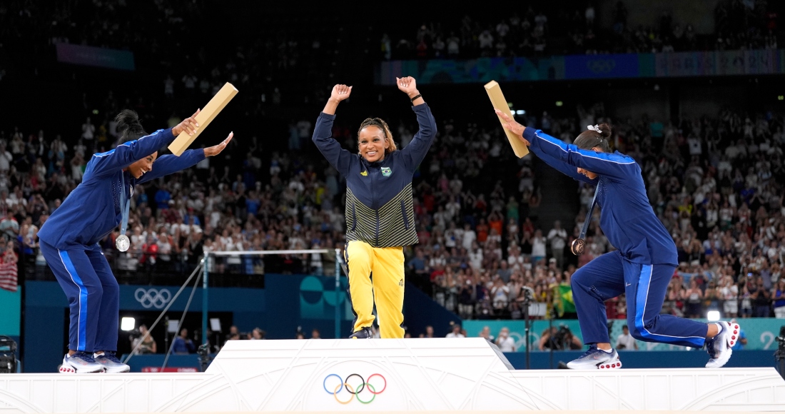 PARÍS (AP) — Rebeca Andrade se convirtió en la primera gimnasta que derrota a Simone Biles en una final de piso de una gran competición internacional y la medalla de oro que conquistó la estableció como la atleta olímpica más laureada de Brasil en la historia de los Juegos Olímpicos.