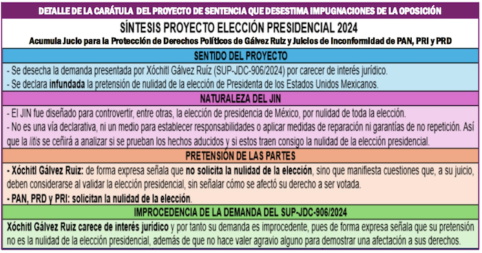 El documento elaborado y firmado por los magistrados De la Mata Pizaña y Fuentes Barrera, advierte: “Sentencia que se dicta con motivo de las demandas presentadas por Xóchitl Gálvez, y el PAN, PRD y PRI, en el sentido de declarar improcedente la primera de ellas, porque la actora carece de interés jurídico, y de declarar infundada la pretensión de nulidad de la elección de la Presidenta de los Estados Unidos Mexicanos”, como pretendían los partidos que integraron la coalición Fuerza y Corazón por México.
