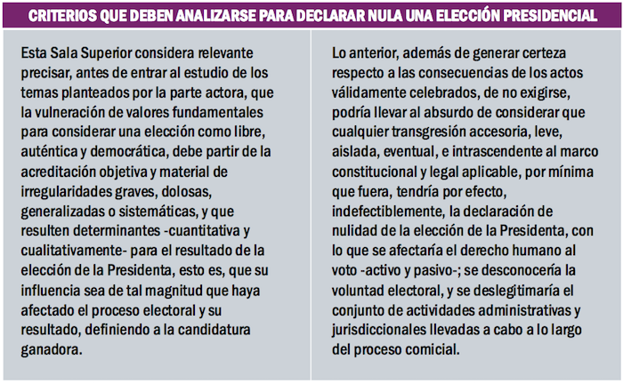 Y agrega, sobre los criterios para considerar la eventual nulidad de una elección: “lo anterior, además de generar certeza respecto a las consecuencias de los actos válidamente celebrados, de no exigirse, podría llevar al absurdo de considerar que cualquier transgresión accesoria, leve, aislada, eventual, e intrascendente al marco constitucional y legal aplicable, por mínima que fuera, tendría por efecto, indefectiblemente, la declaración de nulidad de la elección de la Presidenta, con lo que se afectaría el derecho humano al voto —activo y pasivo—; se desconocería la voluntad electoral, y se deslegitimaría el conjunto de actividades administrativas y jurisdiccionales llevadas a cabo a lo largo del proceso comicial”.