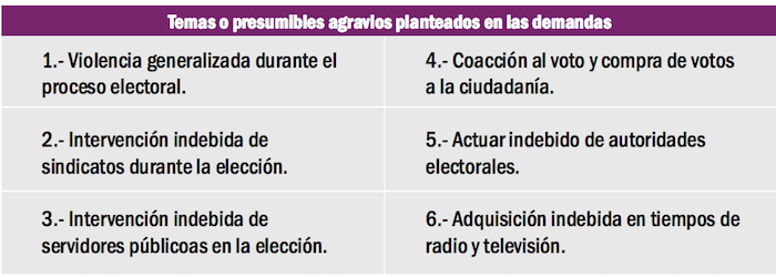 1.- Violencia generalizada durante el proceso electoral. 2.- Intervención indebida de sindicatos durante la elección. 3.- Intervención indebida de servidores públicoas en la elección. 4.- Coacción al voto y compra de votos a la ciudadanía. 5.- Actuar indebido de autoridades electorales y 6.- Adquisición indebida en tiempos de radio y televisión.