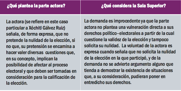 La actora (se refiere en este caso particular a Xóchitl Gálvez Ruiz) señala, de forma expresa, que no pretende la nulidad de la elección, si no que, su pretensión se encamina a hacer valer diversas cuestiones que, en su concepto, implican la posibilidad de afectar al proceso electoral y que deben ser tomadas en consideración para la calificación de la elección.