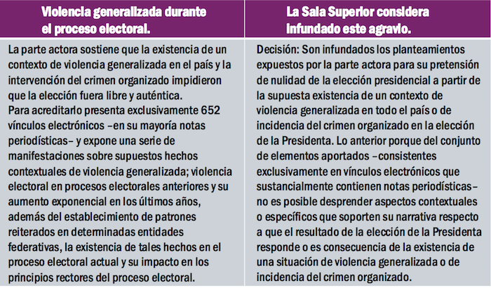 La ponderación que el Tribunal Electoral hace con respecto a este presunto agravio es la siguiente: “Decisión: Son infundados los planteamientos expuestos por la parte actora para su pretensión de nulidad de la elección presidencial a partir de la supuesta existencia de un contexto de violencia generalizada en todo el país o de incidencia del crimen organizado en la elección de la Presidenta. Lo anterior porque del conjunto de elementos aportados –consistentes exclusivamente en vínculos electrónicos que sustancialmente contienen notas periodísticas– no es posible desprender aspectos contextuales o específicos que soporten su narrativa respecto a que el resultado de la elección de la Presidenta responde o es consecuencia de la existencia de una situación de violencia generalizada o de incidencia del crimen organizado”.