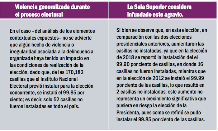 Con respecto a este mismo tema, el Tribunal Electoral argumenta: “En el caso –del análisis de los elementos contextuales expuestos– no se advierte que algún hecho de violencia o irregularidad asociada a la delincuencia organizada haya tenido un impacto en las condiciones de realización de la elección, dado que, de las 170,182 casillas que el Instituto Nacional Electoral previó instalar para la elección concurrente, se instaló el 99.85 por ciento; es decir, solo 52 casillas no fueron instaladas en todo el país”.
