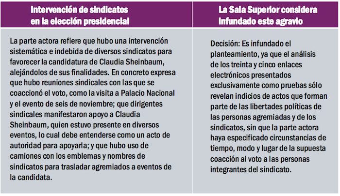 El Tribunal considera infundado este presunto agravio y argumenta: “Decisión: Es infundado el planteamiento, ya que el análisis de los treinta y cinco enlaces electrónicos presentados exclusivamente como pruebas sólo revelan indicios de actos que forman parte de las libertades políticas de las personas agremiadas y de los sindicatos, sin que la parte actora haya especificado circunstancias de tiempo, modo y lugar de la supuesta coacción al voto a las personas integrantes del sindicato”.