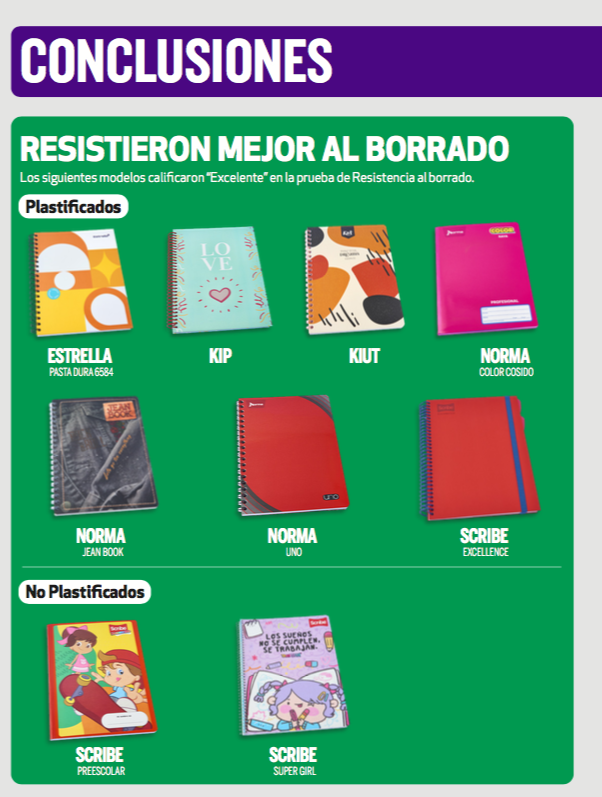 Los modelos que obtuvieron una calificación “Excelente” en la prueba de resistencia al borrado fueron: cuadernos marca Estrella pasta dura 6584; KIP, KIUT, los modelos NORMA que son cocidos, Norma Jean Book Norma UNO, Scribe Excellence, Scribe preescolar y Scribe Super Girl.