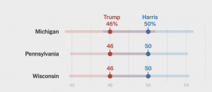 La encuesta, realizada entre mil 973 votantes registrados del 5 al 9 de agosto, muestra que Harris tiene un 50 por ciento de apoyo entre los votantes probables en Wisconsin, Pensilvania y Michigan. Trump tuvo un 46 por ciento de apoyo en cada uno de los estados.