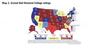 De acuerdo con Crystal Ball, del Centro de Política de la Universidad de Virginia, ahora mismo la elección está en "empate técnico". Trump sumaría 235 votos electorales de los 270 necesarios para ganar la Presidencia estadounidense, mientras que Harris sumaría 226 votos electorales. En juego, hay 77 votos electorales, según este ejercicio: Arizona, Georgia, Michigan, Nevada, Pensilvania y Wisconsin.