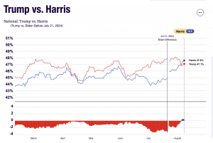 Los promedios de encuestas en Estados Unidos marcan un giro claro desde la salida de Biden de la carrera presidencial: la ventaja cada vez más amplia de Trump se ha reducido a cenizas ante el ascenso de la Vicepresidenta, quien no sólo recortó esa distancia sino que ahora lidera la contienda, incluso en algunos estados clave.