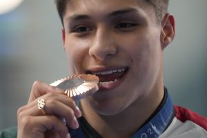 El mexicano Osmar Olvera muerde la medalla de bronce que consiguió en el trampolín de tres metros de los Juegos Olímpicos de París 2024 el jueves 8 de agosto del 2024 en Saint-Denis, Francia. Foto: Dar Yasin, AP