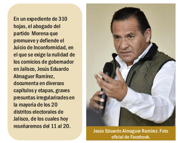 En un expediente de 310 hojas, el abogado del partido Morena que promueve y defiende el Juicio de Inconformidad, en el que se exige la nulidad de los comicios de gobernador en Jalisco, Jesús Eduardo Almaguer Ramírez, documenta en diversos capítulos y etapas, graves presuntas irregularirades en la mayoría de los 20 distritos electorales de Jalisco, de los cuales hoy reseñaremos del 11 al 20.