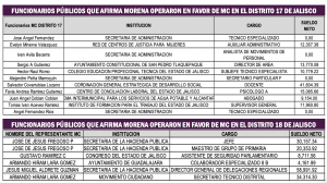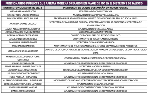 “En consecuencia -señala Morena en la página 129 de su Juicio de Inconformidad-, en el caso se configura, por un lado, la nulidad de elección por violación sustantiva, grave y generalizada a múltiples principios constitucionales como la imparcialidad, la neutralidad y la equidad, y por otra parte, la causal directa de nulidad de elección”. Estas conductas, que favorecieron a Pablo Lemus Navarro, el candidato de Movimiento Ciudadano a la gubernatura de Jalisco, se repitieron en los 20 distritos electorales del estado y Morena presenta las listas de los presuntos infractores electorales.