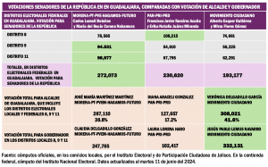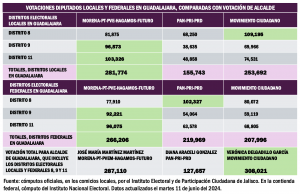 En la página 196 de la formulación de su Juicio de inconformidad, Morena advierte que “a pesar de que Jalisco tiene tanto 20 distritos electorales locales como federales, el total de votos emitidos es diferente a la Presidencia de la República y para la Gubernatura del Estado”. Pone como ejemplo el Distrito 1, que cubre las regiones Valles y Norte de Jalisco, con cabecera en Tequila, donde los votos válidos y nulos sumados, dan 185 mil 693 [para Presidenta de la República], pero para la gubernatura apenas llegan a 141 mil 161 votos. Es decir, hay una diferencia de 44 mil 532 votos.