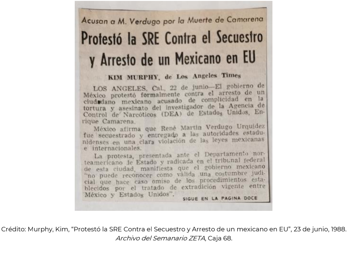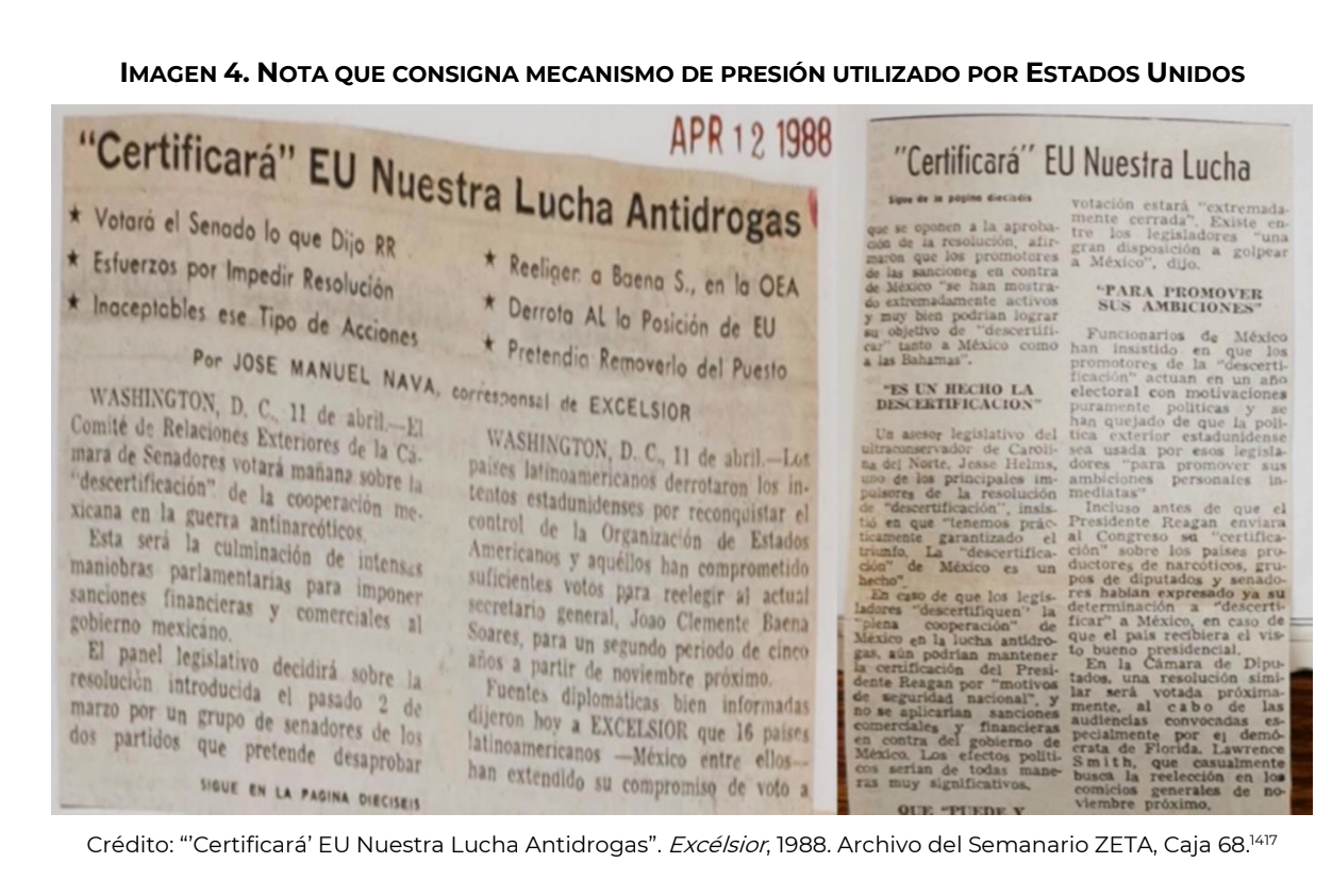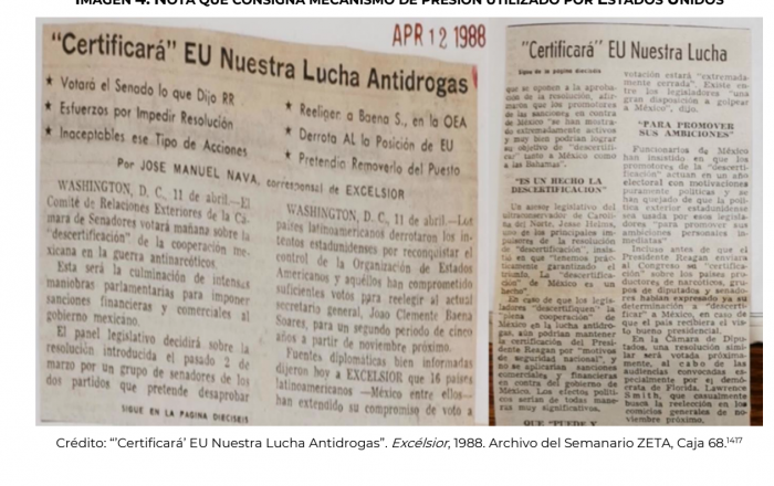 Nota que consigna mecanismo de presión utilizado por Estados Unidos: Foto: Crédito: “’Certificará’ EU Nuestra Lucha Antidrogas”. Excélsior, 1988. Archivo del Semanario ZETA, Caja 68.
