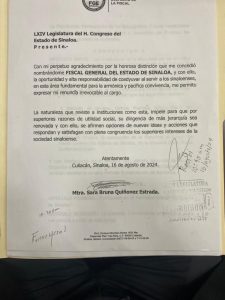 En el documento agradeció el nombramiento de Fiscal General y la oportunidad coadyuvar y servir a los sinaloenses.
