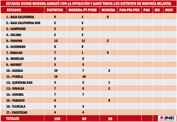Hoy veremos algunos detalles de esas 17 entidades donde Morena y sus aliados arrollaron a la oposición y en donde ganaron todas las 108 diputaciones federales de Mayoría Relativa que estuvieron en juego.