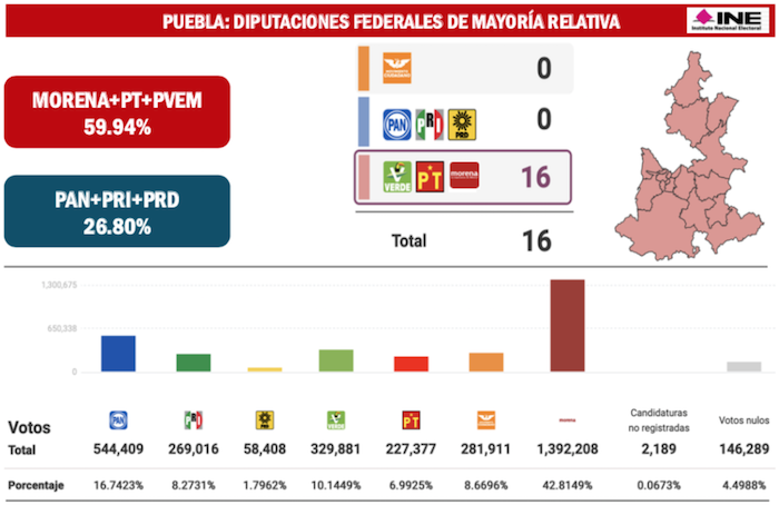 En Puebla la coalición morenista ganó 16 de 16 diputaciones Federales de Mayoría Relativa, con un porcentaje de votos del 59.94 por ciento contra el 26.80 por ciento de la coalición Fuerza y Corazón por México, de PAN, PRI, PRD. Morena, de manera individual sumó el 42.81 por ciento de los sufragios.