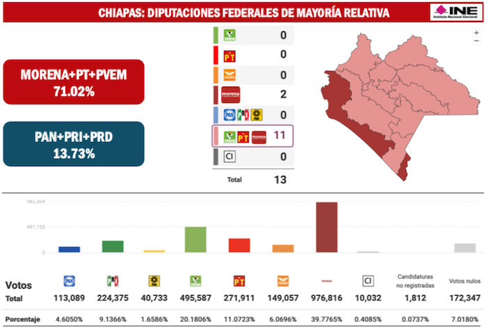 En Chiapas los números de la coalición Sigamos Haciendo Historia son aplastantes, al triunfar en 13 de los 13 distritos electorales en disputa, con una votación del 71.02 por ciento, contra el 13.73 por ciento de sus rivales de Fuerza y Corazón por México. Por separado Morena tuvo el 39.77 por ciento de los sufragios y el Partido Verde Ecologista de México aportó el 20.18 por ciento en esta entidad.