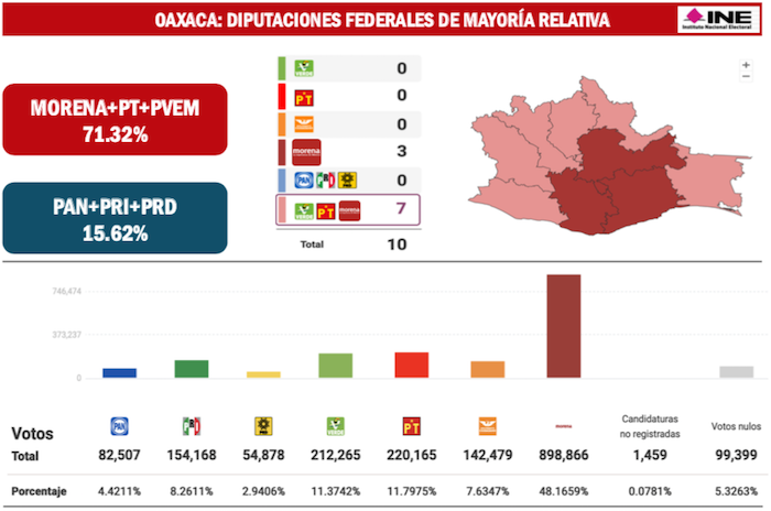 El porcentaje de votos de la alianza morenista también es impresionante en Oaxaca, donde sumó el 71.32 por ciento de los sufragios, al llevarse los 10 triunfos en los 10 distritos de Mayoría Relativa. La oposición apenas alcanzó un porcentaje del 15.62 por ciento. En Oaxaca, por separado, Morena tuvo un 48.16 por ciento de los sufragios, en tanto que el PT y el PVEM sumaron, cada uno de manera individual, poco más del 11 por ciento.