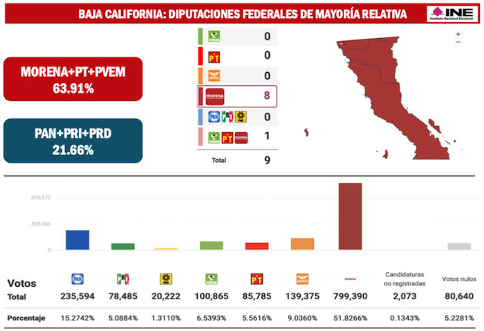 En Baja California Morena y sus aliados ganaron 9 de 9 distritos de Mayoría Relativa, con un porcentaje de votos del 63.91 por ciento, contra el 21.66 por ciento de la oposición encabezada por el PAN. Por separado, Morena tuvo un porcentaje alto del 51.82 por ciento.