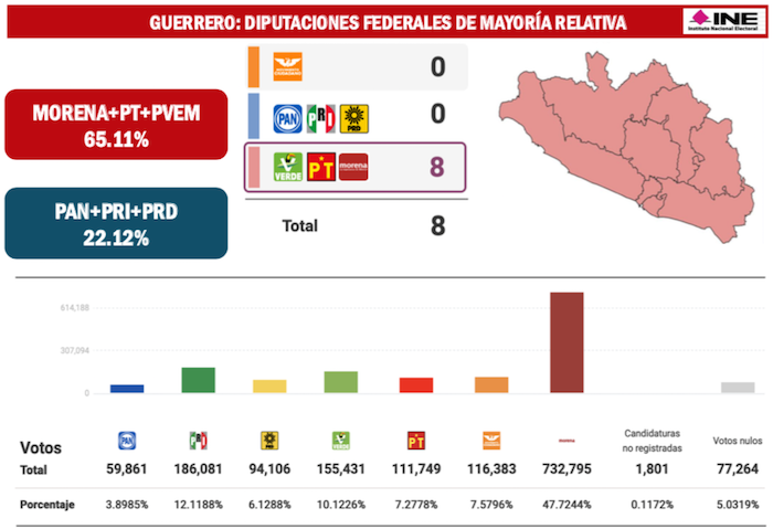 En Guerrero la coalición Sigamos Haciendo Historia obtuvo 8 de 8 triunfos de Mayoría Relativa y su porcentaje fue del 65.11 por ciento. Mientras que la oposición PAN-PRI-PRD sumó el 22.12 por ciento. Por separado Morena alcanzó un porcentaje del 47.72 por ciento. Mientras que en Tabasco la victoria del partido guinda fue aplastante pues ganó 6 de 6 distritos electorales de Mayoría Relativa con una votación del 60.09 por ciento, en forma individual. Sumados los portcentajes de sus aliados PT y PVEM en Tabasco, la coalición Sigamos Haciendo Historia llega a un impresionante porcentaje del 73.20 por ciento.
