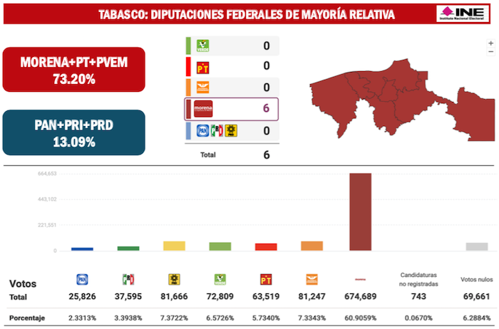 Además, Morena y sus aliados sumaron altos porcentajes de votos que se reflejarán esta semana, cuando el Instituto Nacional Electoral, adjudique los 200 diputados federales de Representación Proporcional, con los que obtendrán la Mayoría Calificada en la Cámara de Diputados del Congreso de la Unión, para la que se requieren 334 legisladores, cifra que la coalición Sigamos Haciendo Historia superará cómodamente. Tampoco habría que perder de vista que hubo otros siete estados en los cuales la oposición solo pudo arrebatarle a la coalición morenista un diputado federal por entidad federativa.