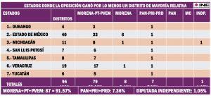 En el Estado de México, una victoria en la contienda por las diputaciones federales de Mayoría Relativa fue muy poco consuelo para la coalición opositora, frente a 39 triunfos de Morena y sus aliados; en Veracruz, la coalición oficialista ganó 18 distritos electorales de Mayoría y sólo le cedió uno a sus rivales y, en Michoacán, de 11 distritos electorales de Mayoría Relativa, Morena y sus aliados ganaron 9, uno quedó en manos de la coalición encabezada por el PAN y dejaron espacio para una meritoria victoria de la candidata independiente, Guadalupe Araceli Mendoza Arias, en un distrito con cabecera en Uruapan.