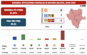 En Durango, donde estuvieron en juego cuatro diputaciones de Mayoría Relativa, el único distrito electoral que ganó la oposición fue el número 4, con cabecera en Victoria de Durango, donde se impuso la candidata de la coalición PAN-PRI-PRD Silvia Patricia Jiménez Delgado.