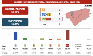 Y finalmente en el estado de Yucatán, cuya gubernatura Morena le arrebató al PAN, de 6 distritos en disputa, la coalición PAN-PRI-PRD sólo rescató uno, el Distrito 4 con cabecera en Mérida, donde triunfó María Isabel Rodríguez Heredia.