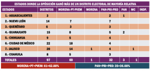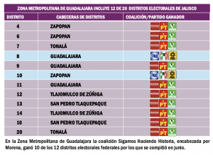 En Jalisco las dimensiones del desastre para Movimiento Ciudadano lo reflejan los números: Morena y sus aliados ganaron 15 de 20 distritos electorales de Mayoría Relativa; la coalición PAN-PRI-PRD obtuvo cuatro victorias y el partido naranja apenas un triunfo. Pero lo más grave fue que de los 12 distritos electorales federales que tienen cabecera en la zona metropolitana tapatía, Morena y sus aliados ganaron 10, mientras que la alianza encabezada por el PAN sumó los otros dos.