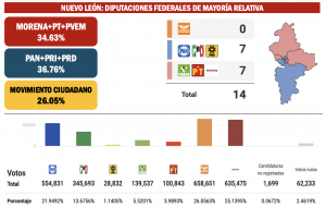 En el estado de Nuevo León, que gobierna Samuel García Sepúlveda, de Movimiento Ciudadano, el partido naranja no ganó ninguna de las 14 diputaciones federales por las que se compitió y que finalmente se repartieron por partes iguales las coaliciones encabezadas por Morena y por el PAN.