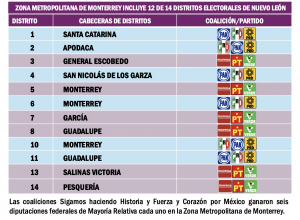 Los comicios pasados, que ratificaron los merecimientos de la coalición Sigamos Haciendo Historia para tener la Mayoría Calificada en la Cámara de Diputados de la federación, mostraron también que el partido Movimiento Ciudadano ha perdido mucho impulso, pues prácticamente fue borrado de las zonas metropolitanas de Monterrey y Guadalajara, donde las coaliciones Sigamos Haciendo Historia y Fuerza y Corazón por México, le arrebataron todas las diputaciones federales que se jugaron en junio.