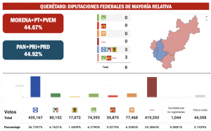 En Querétaro las dos coaliciones se repartieron salomónicamente las seis diputaciones federales de Mayoría Relativa que estuvieron en juego: tres para cada una, en una entidad en la cual era predominante la fuerza del PAN, que gobierna la entidad.