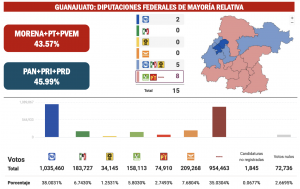 En Guanajuato, estado gobernado por el PAN desde hace 33 años, fue notable el retroceso de la derecha, pues la coalición morenista ganó 8 de las 15 diputaciones de Mayoría Relativa en esa entidad.