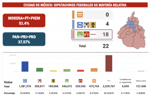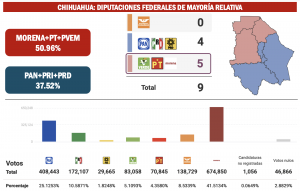 Sigamos Haciendo Historia tuvo una significativa recuperación electoral en dos entidades muy importantes: Chihuahua y Ciudad de México. En la entidad norteña, gobernada por el PAN, la coalición morenista ganó cinco de nueve diputaciones federales; en la Ciudad de México, Morena y sus aliados sumaron 18 de 22 curules de Mayoría Relativa en el Congreso federal.