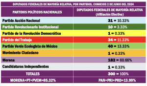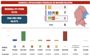 Finalmente, en Coahuila, Sigamos Haciendo Historia derrotó a la oposición en una entidad gobernada por el PRI, al sumar cinco de ocho distritos electorales federales de Mayoría Relativa.
