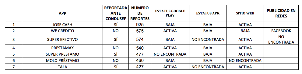 De acuerdo con datos del Consejo Ciudadano, de las 1,046 apps reportadas, 182 están activas en Google, 27 en APK y 35 en ambas plataformas. Además, se encontraron 316 que tienen página web.