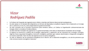 Rodríguez Padilla es experto en economía y política de la energía, organización y regulación de las industrias de la energía, contratos, régimen fiscal, seguridad energética, transición energética, petróleo, gas natural, electricidad e integración energética en América del Norte. Tiene 42 años de experiencia en el sector energético.