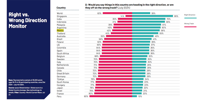 Al responder la pregunta: ¿Diría que las cosas en este país van en la dirección correcta o van por el camino equivocado?, más de la mitad de los mexicanos afirmaron que el país va bien, lo que posiciona a esta nación en los primeros seis lugares positivos de esta lista, sólo por detrás de países como Singapur, con 86 por ciento; India, con el 70 por ciento; Indonesia, con el 69 por ciento; Malasia, con el 61 por ciento; y Argentina, con el 60 por ciento.